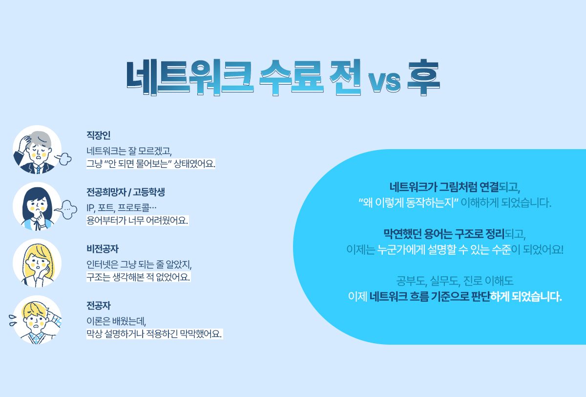 IT 전공을 고민 중이었는데 네트워크 기초를 배우면서 내가 어떤 방향으로 가고 싶은지 감이 좀 잡혔어요.